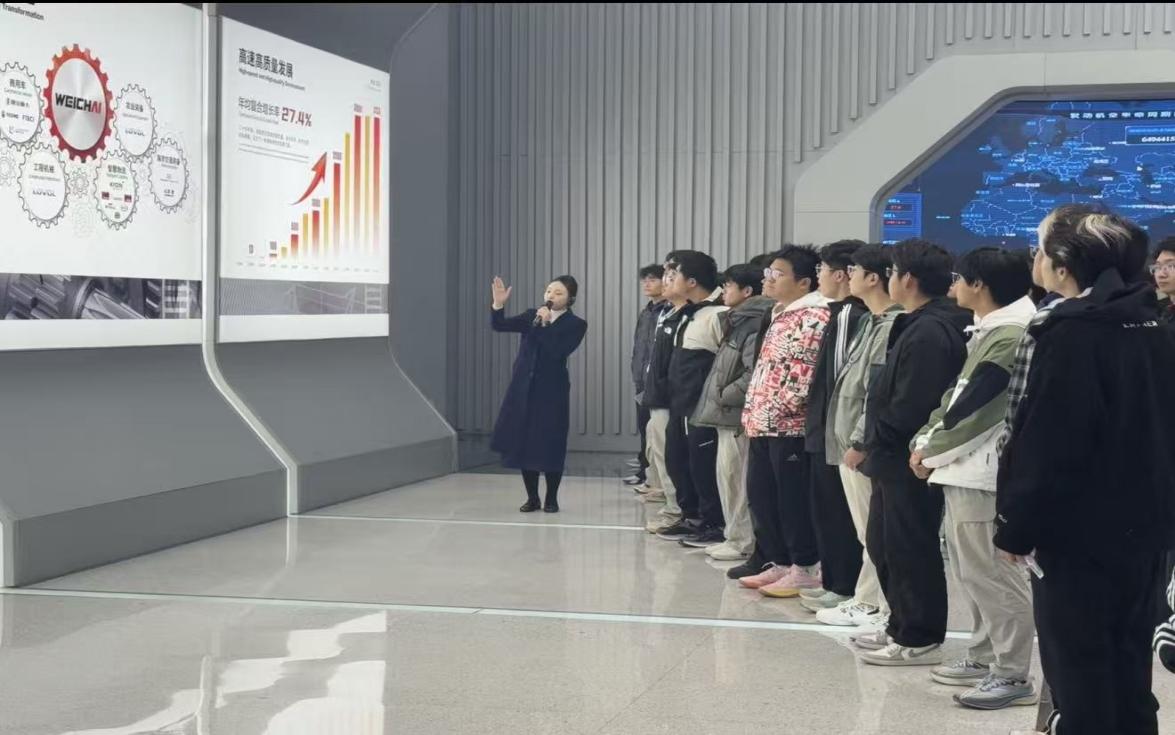 紧接着同学们参观了潍柴大学的校史展区,讲解员重点介绍了潍柴大学“产教融合、知行合一”的办学理念,其依托潍柴集团产业优势,打造了从基础教学到实训实操的完整育人链条,培养了大批适配行业需求的技术技能人才。
