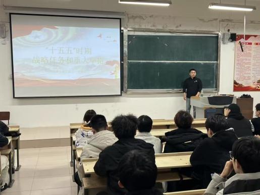 团委副书记兼学生工作办公室副主任于振山老师为大家讲授了“十五五”时期战略任务及重大举措。鼓励大家紧跟国家战略方向,了解国家政策方针,坚持和加强党中央集中统一领导,坚持人民至上,发挥专业特长加快高水平科技自立自强,发展新质生产力,为推进中国式现代化凝聚磅礴力量。