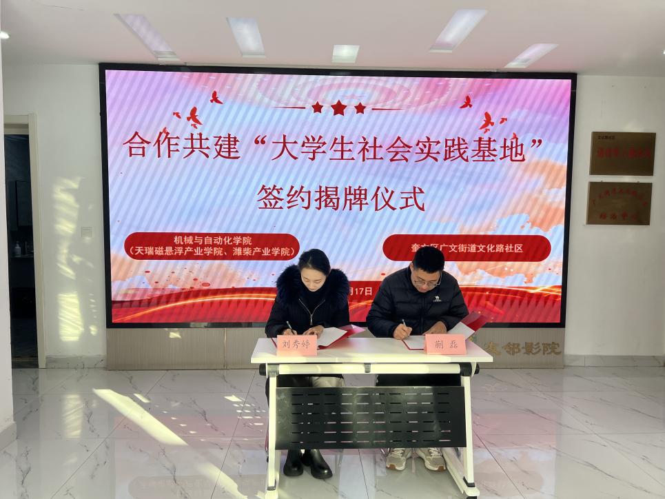 为深化校社合作,推动大学生社会实践与基层社会治理深度融合,12月17日,学院与潍坊市奎文区广文街道文化路社区举行大学生社会实践基地签约仪式。学院团委教师代表刘秀婷与广文街道文化路社区党委副书记蒯磊一同为实践基地揭牌,同心铸梦志愿服务队学生代表及社区工作人员共同出席活动。此次签约标志着双方在资源共享、服务社会、协同育人方面迈出坚实一步。