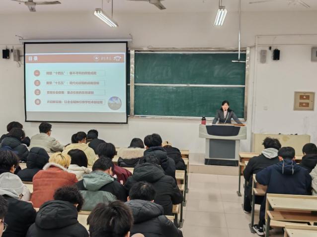 宣讲环节,祝教授围绕党的二十届四中全会精神核心,分别从“回望十四五”“展望十五五”“会议重要任务”与“全会精神引领高校新建设”四部分展开宣讲。祝教授首先梳理“十四五”时期我国在经济发展、科技攻关、制造业升级等领域的突破性成就,以此为基础过渡到“十五五”规划中“建设现代化产业体系”“推进科技自立自强”等核心部署,同步阐释党的二十届四中全会提出的“六个坚持”重要原则与重点任务,明确高质量发展主题下青年群体的责任与使命。