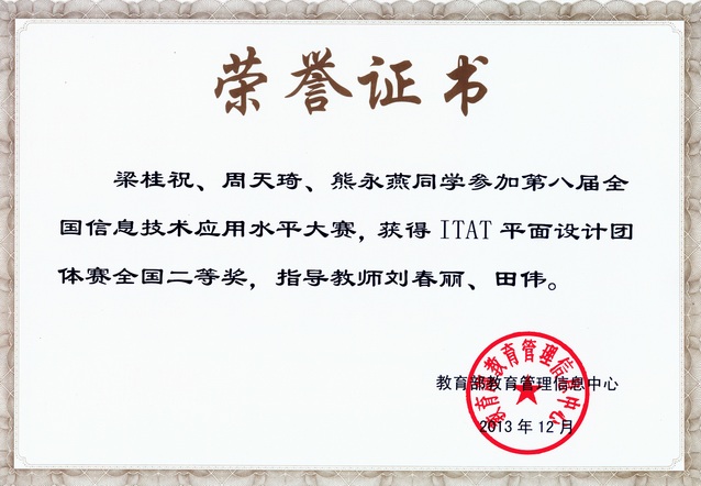 | 100 | 2013.12 | 第八届全国信息技术应用水平大赛 | 第八届全国信息技术应用水平大赛 二等奖 | 国家级 | 教育部教育管理信息中心 |