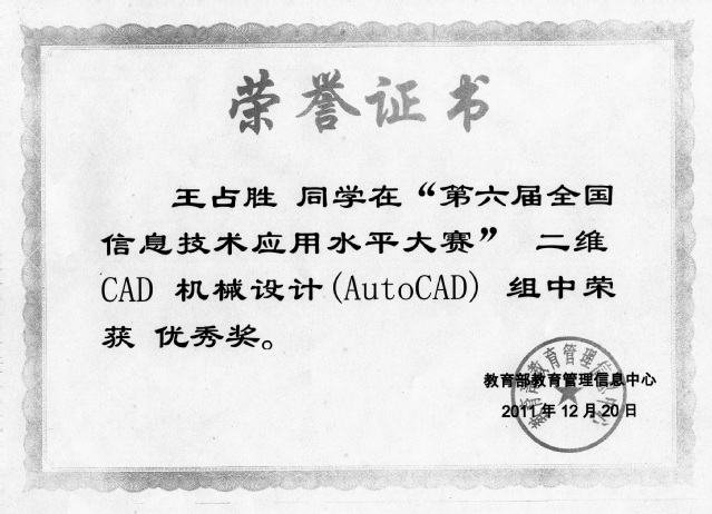 | 112 | 2011.12 | 二维CAD机械设计(AutoCAD) | 第六届全国信息技术应用水平大赛 三等奖 | 国家级 | 教育部教育管理信息中心 |