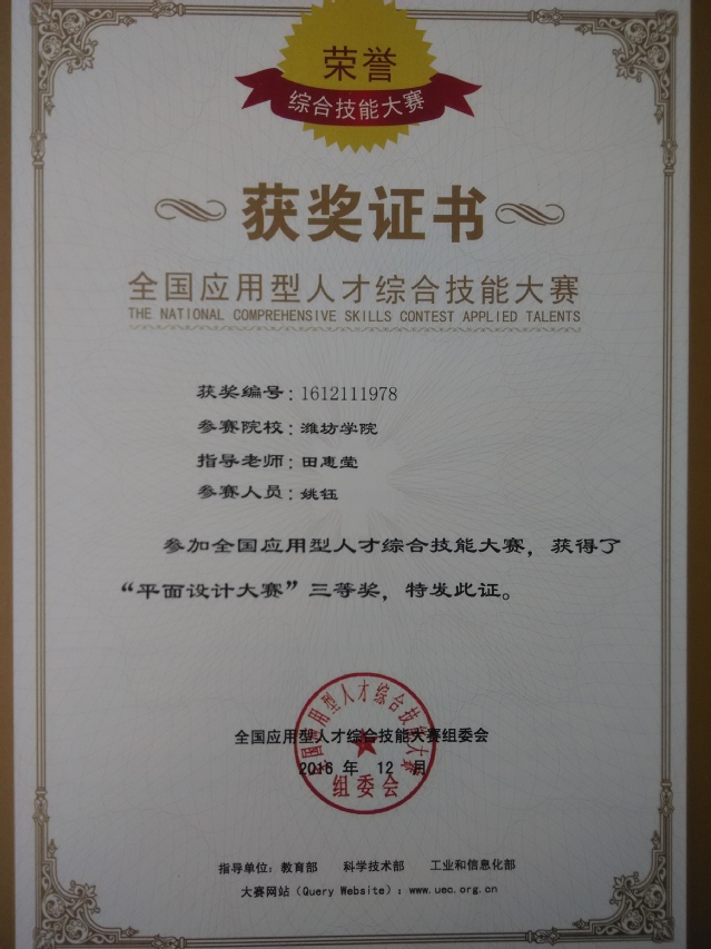 | 44 | 2016.12 | 平面设计大赛 | 全国应用型人才综合技能大赛 二等奖 | 国家级 | 全国应用型综合技能大赛组委会 |