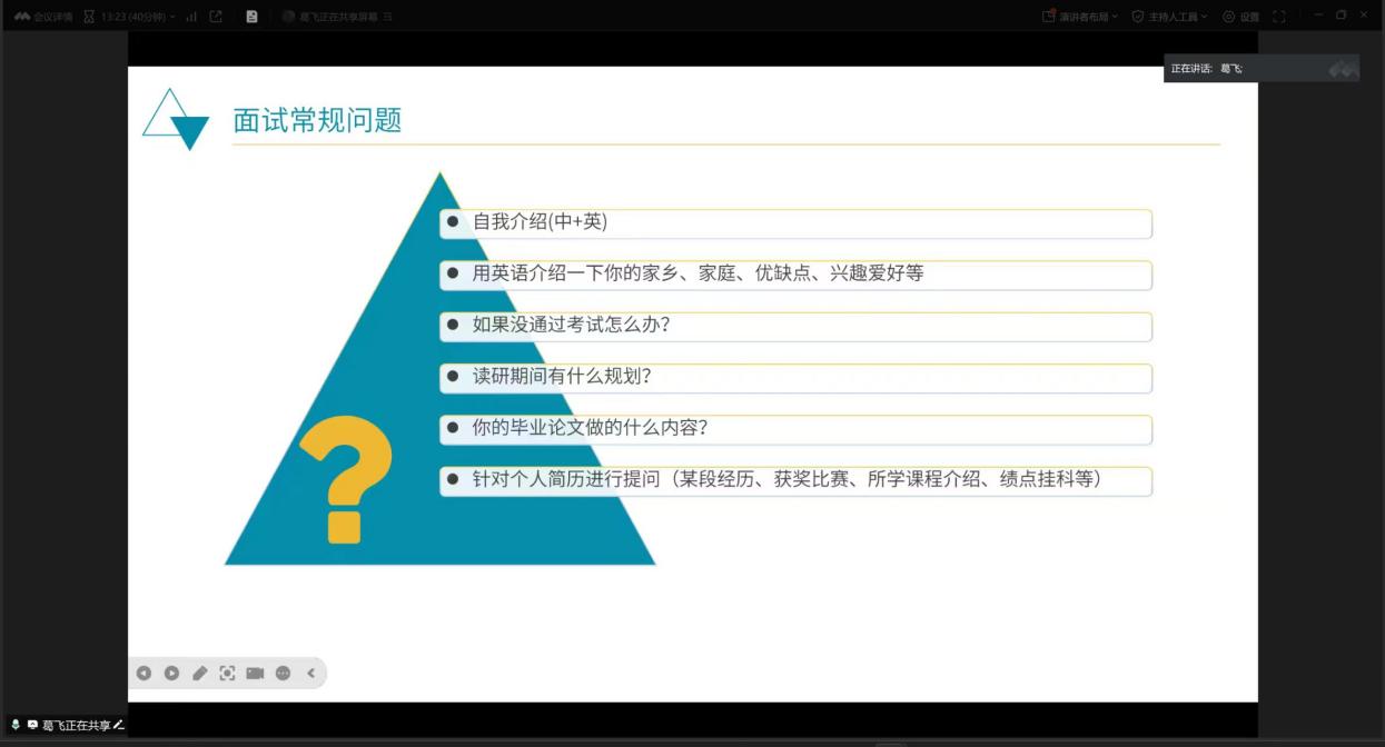 葛飞和薛崇创聚焦考研面试的高频考点与应对技巧,带来极具实操性的指导。她结合自身面试经验,逐一拆解面试各类常规问题:从中英文自我介绍的撰写优化,到家乡、家庭、个人优缺点等英语日常问答的准备方法,再到考研失利应对、读研规划、毕业论文核心内容等高频综合问题的作答思路,均给出细致讲解。同时她提醒同学们,要提前梳理完善个人简历,针对简历中的项目经历、获奖赛事、所学课程等内容做好充分准备,以真诚的态度从容应对面试官提问。